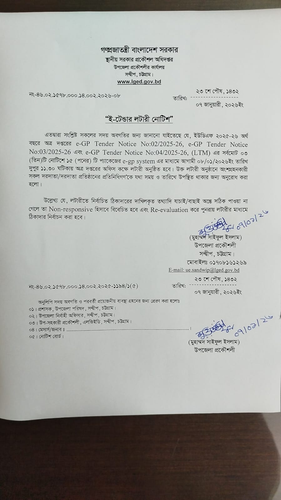 উপজেলা উন্নয়ন তহবিল ২০২৫-২৬ টেন্ডার লটারি নোটিশ